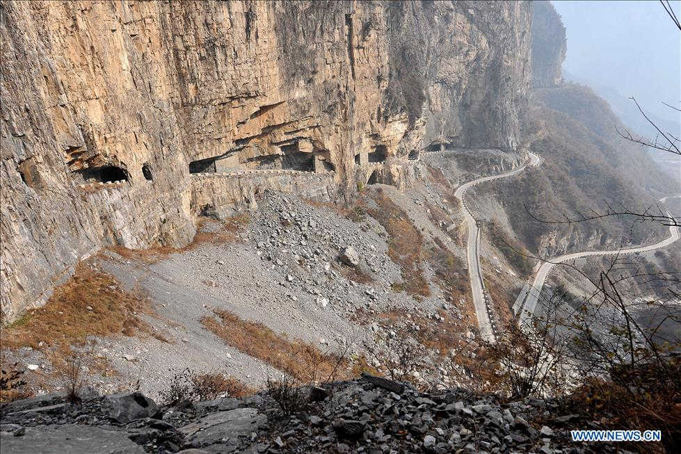 | Photo taken on Nov. 19, 2014 shows a general view of a road built on the cliff of the Taihang Mountains in Lingchuan County, north China's Shanxi Province. The 7.5-kilometer road, linking a mountainous villagewith county town, looks like hanging on a wall from afar.(Xinhua/Zhan Yan) |