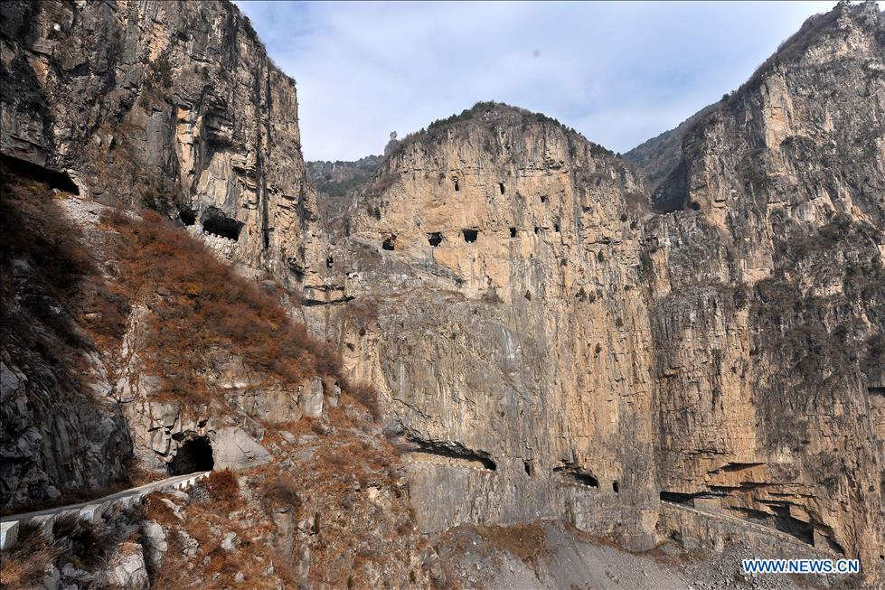 Photo taken on Nov. 19, 2014 shows a general view of a road built on the cliff of the Taihang Mountains in Lingchuan County, north China's Shanxi Province. The 7.5-kilometer road, linking a mountainous villagewith county town, looks like hanging on a wall from afar.(Xinhua/Zhan Yan)