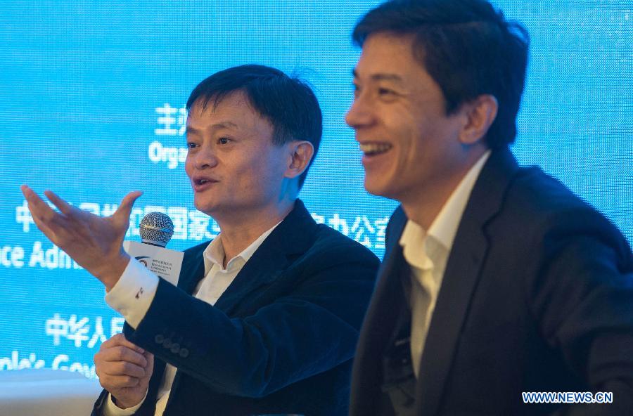 Ma Yun (L), founder and chairman of China's leading e-commerce company Alibaba Group, and Co-founder, Chairman and CEO of Chinese search engine Baidu Li Yanhong, attend the Chinese and Foreign Internet Leaders Summit during the World Internet Conference in Wuzhen, east China's Zhejiang Province, Nov. 20, 2014. Representatives from nearly 100 countries and regions took part in the three-day 2014 World Internet Conference that kicked off Wednesday in Wuzhen. (Xinhua/Han Chuanhao)
