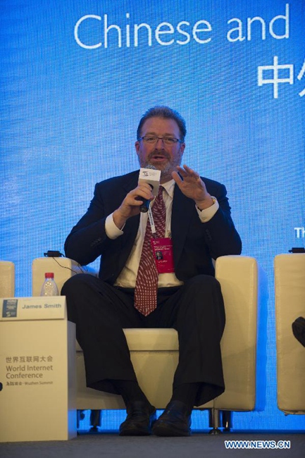 Thomson Reuters President and CEO Jim Smith addresses the Chinese and Foreign Internet Leaders Summit during the World Internet Conference in Wuzhen, east China's Zhejiang Province, Nov. 20, 2014. Representatives from nearly 100 countries and regions took part in the three-day 2014 World Internet Conference that kicked off Wednesday in Wuzhen. (Xinhua/Ju Huanzong)