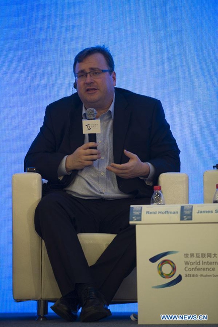 Reid Hoffman, co-founder of Linkedin, the world's largest business-oriented social network, addresses the Chinese and Foreign Internet Leaders Summit during the World Internet Conference in Wuzhen, east China's Zhejiang Province, Nov. 20, 2014. Representatives from nearly 100 countries and regions took part in the three-day 2014 World Internet Conference that kicked off Wednesday in Wuzhen. (Xinhua/Ju Huanzong)