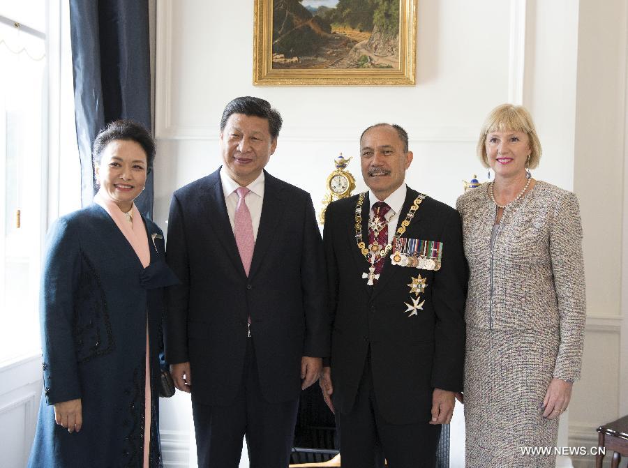 Chinese President Xi Jinping (2nd L) and his wife Peng Liyuan (1st L) pose for photos with New Zealand Governor-General Jerry Mateparae (2nd R) and his wife Janine Grenside in Wellington, New Zealand, Nov. 20, 2014. Xi Jinping met with Mateparae here on Thursday. (Xinhua/Li Xueren)
