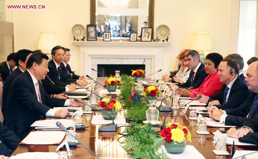 Chinese President Xi Jinping (1st L) and New Zealand's Prime Minister John Key (2nd R) hold talks in Wellington, New Zealand, Nov. 20, 2014. (Xinhua/Ma Zhancheng)