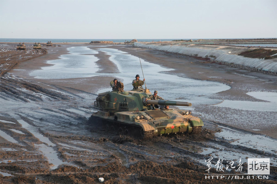 In this autumn, a field artillery brigade of the 27th Group Army of the PLA maneuvers from northwest China to the beach of the Bohai Sea to conduct a live-fire drill and successfully hit a dozen of mobile targets on the sea. (BJ.81.cn/Chang Tianlong)