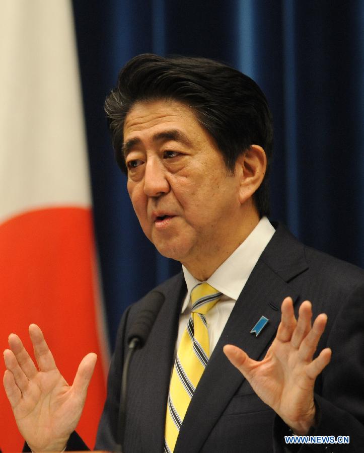 Japanese Prime Minister Shinzo Abe speaks during a press conference at his official residence in Tokyo, Japan, Nov. 21, 2014. Japan dissolved the House of Representatives, or the lower house in its bicameral parliament, on Friday for a general election slated for Dec. 14, with Prime Minister Shinzo Abe's economic policies dubbed "Abenomics" and other polices to be tested in the looming vote. (Xinhua/Stringer)