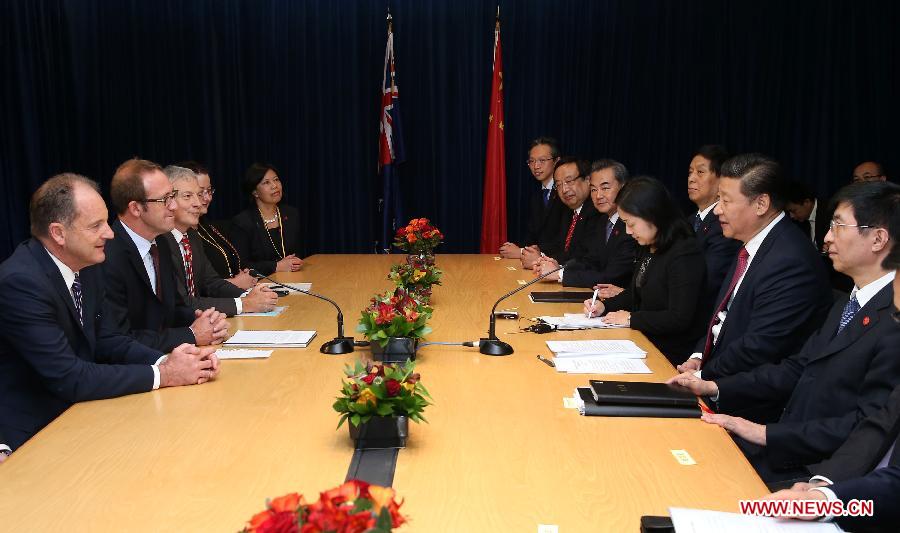 | Chinese President Xi Jinping (2nd R) meets with Andrew Little (2nd L), leader of New Zealand's Labour Party, in Auckland, New Zealand, Nov. 21, 2014. (Xinhua/Pang Xinglei) |