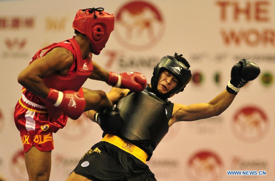 Li Shen (R) of China competes against Sentwali Kofie woolridge of Bermuda at the Men's Sanda-70kg final event during the 7th Sanda World Cup in Jakarta, Indonesia, Nov. 21, 2014. (Xinhua/Zulkarnain)