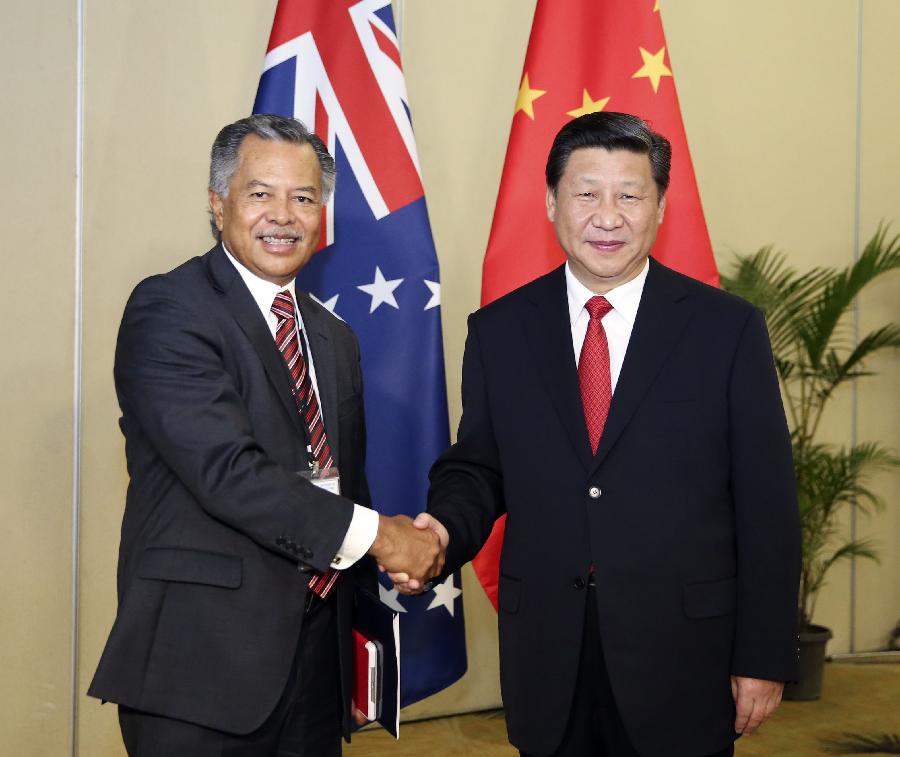 Chinese President Xi Jinping (R) meets with the Cook Islands Prime Minister Henry Puna in Nadi, Fiji, Nov. 22, 2014. (Xinhua/Ding Lin)