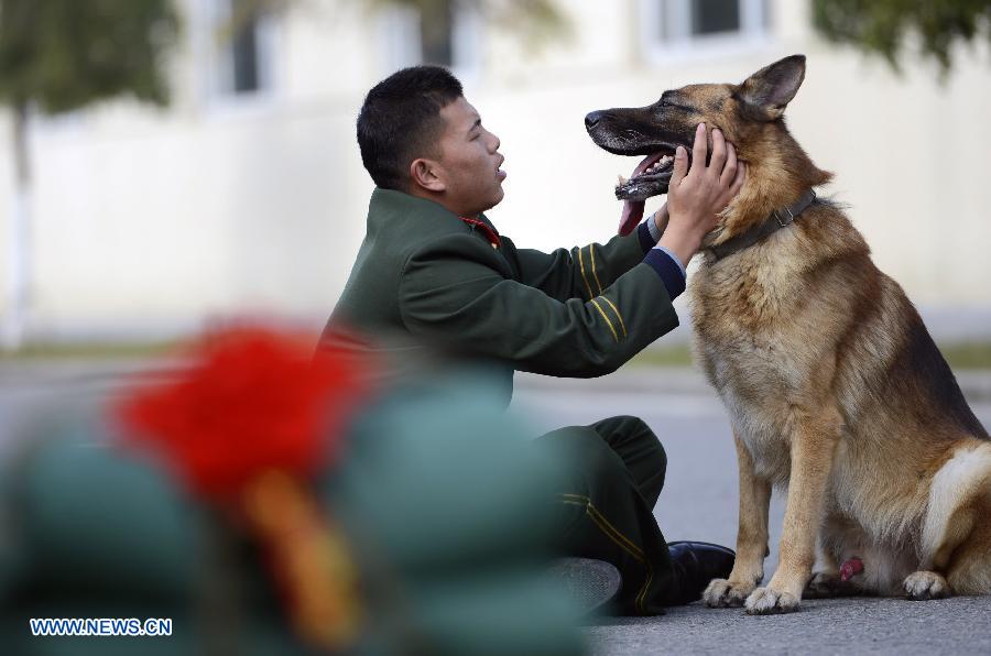 Two veterans say goodbye to their police dogs in Nanjing, China, on Nov 21, 2014. (Photo Source: Xinhua)