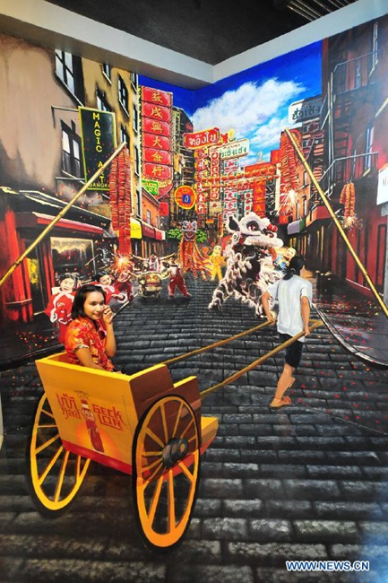 A visitor poses for photos at Magic Art Museum in Bangkok, Thailand, Nov. 24, 2014. The Magic Art Museum Bangkok presents modern 3D art works. (Xinhua/Rachen Sageamsak)