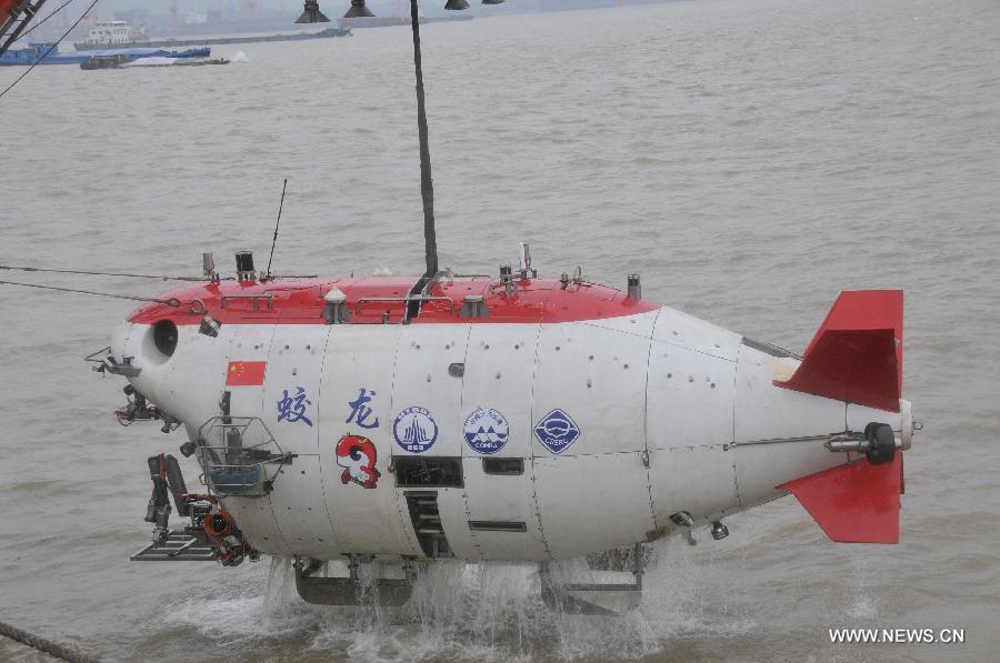 | China's manned submersible Jiaolong surfaces during a drill in Jiangyin City, east China's Jiangsu Province, Nov. 24, 2014. It is the last drill for Jiaolong before it starts a scientific research voyage in the southwest Indian Ocean on Nov. 25, 2014. (Xinhua/Zhang Xudong) |