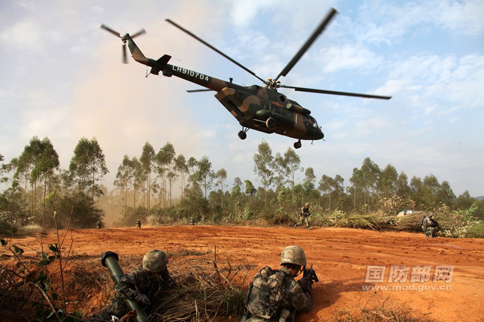 A regiment from Nanjing Military Region conducts joint military drill with an army aviation regiment in strange areas on Nov. 16, 2014. (Mod.gov.cn/Wu Da)