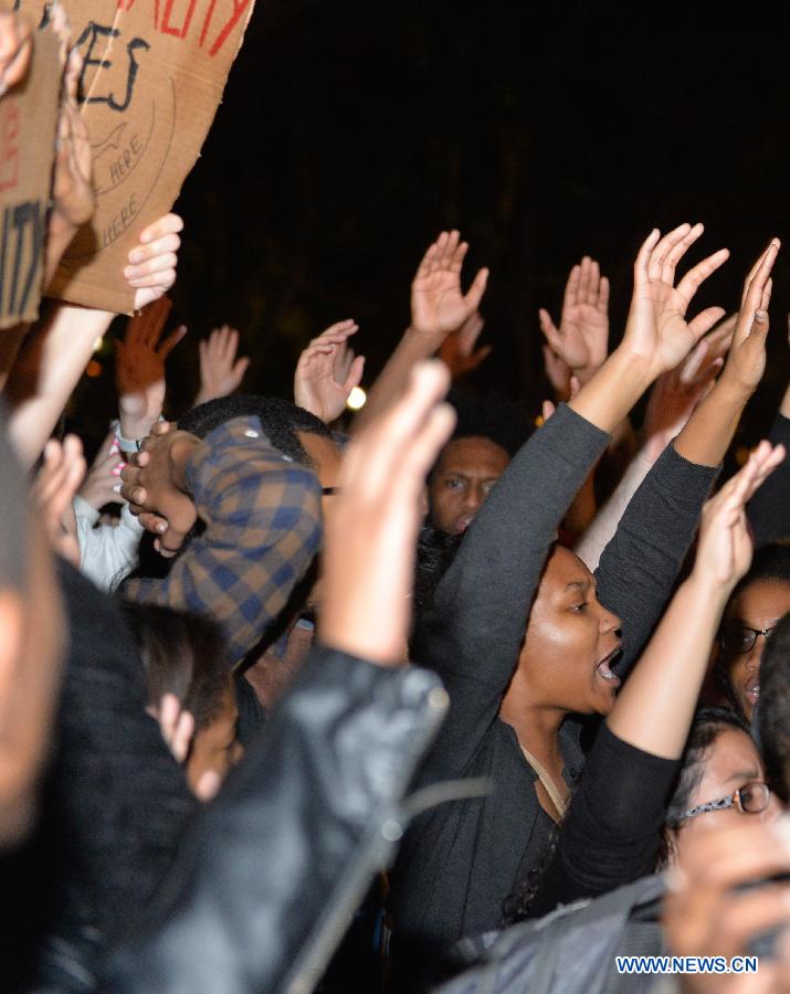 People protest against the grand jury's decision not to charge police officer Darren Wilson in the fatal shooting of African American youth Michael Brown in Ferguson in August, in front of the White House in Washington D.C., the United States, Nov. 24, 2014. More than 200 people took part in the protest in front of the White House on Monday. (Xinhua/Bao Dandan)