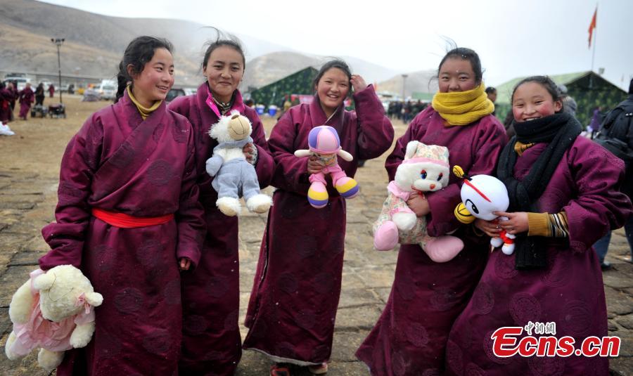 Girls in quake-hit zone give a bright smile to the camera with donated plush toys held in hands on November 24, 2014. A total of 300 toys from primary students of Chengdu were dispatched to children in a school of Kangding county, Ganzi Tibetan Autonomous Prefecture in Southwest China's Sichuan province on November 24, 2014. [Photo: China News Service/ Liu Zhongjun]
