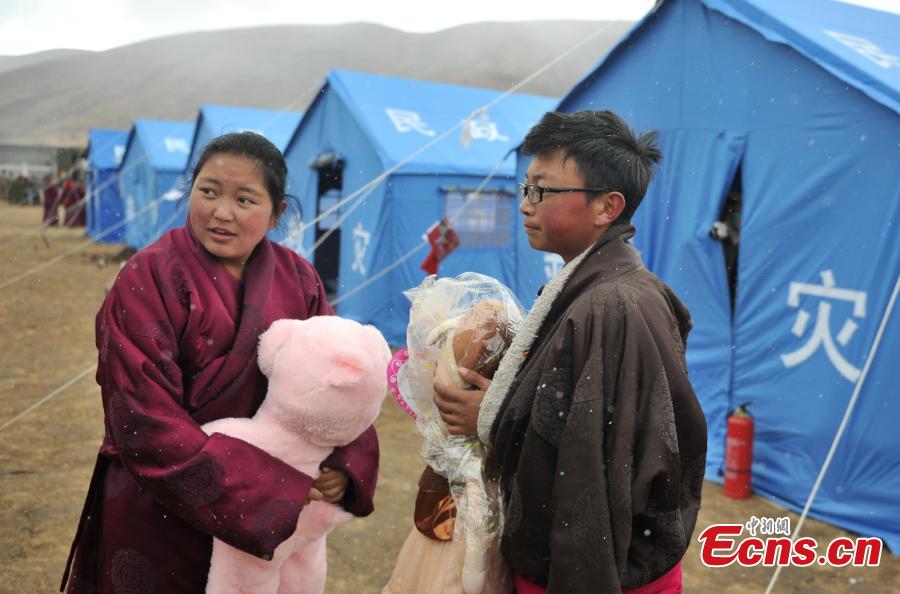 | Toys donated by students form Sichuan’s Chengdu put a smile on faces of children in quake-hit zone in Kangding county, Ganzi Tibetan Autonomous Prefecture in Southwest China's Sichuan province on Monday, November 24, 2014. A 6.3-magnitude earthquake hit Kangding county at 4:55 pm, last Saturday. [Photo: China News Service/ Liu Zhongjun] |