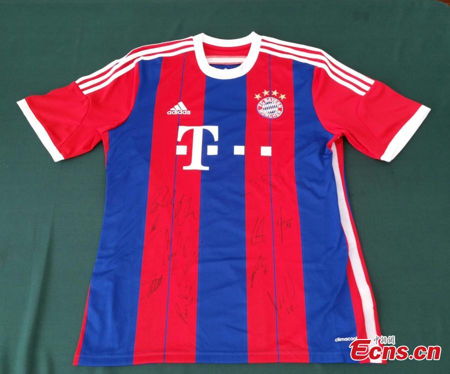 | Photo taken on November 24, 2014 shows the jersey which was given as a gift to Chinese Premier Li Keqiang from Horst Seehofer, governor of the German state of Bavaria. The No 8 shirt features the premier’s name on the back, and signatures of all players of Bayern Munich on its front. [Photo: China News Service/ Peng Jiansheng] |