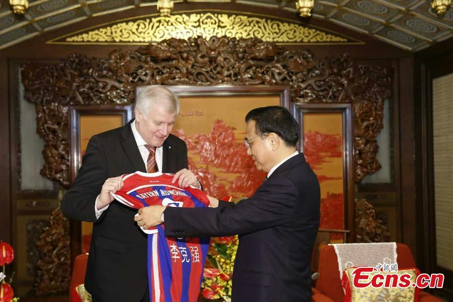 Chinese Premier Li Keqiang (R) receives a jersey of the German football team Bayern Munich as a gift from visiting governor of the German state of Bavaria Horst Seehofer in Beijing on Monday, November 24, 2014. Li expressed China’s hope to strengthen sports industry cooperation with Germany during his meeting with the visiting governor. [Photo: China News Service/ Peng Jiansheng]