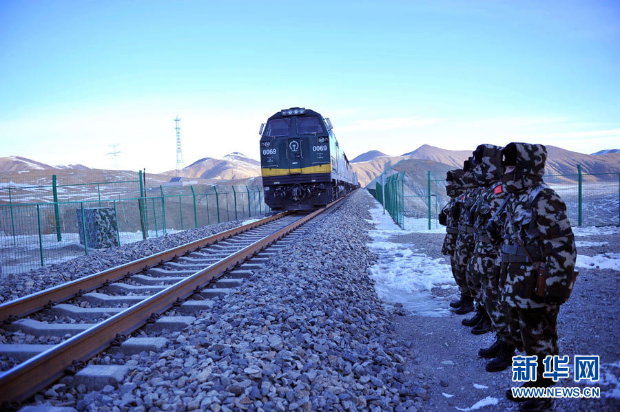 The patrolling soldiers watch the train passing by. (Xinhua/Ma Ding)