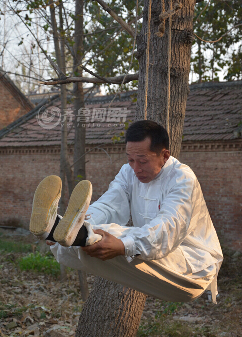 Cheng Haoliang, living in Heze City of Shandong province, hangs himself from a tree and keeps the feet off the ground. According to Cheng, it's a traditional Chinese kung fu stunt which he has practiced for ten years. (Photo/iqilu.com)
