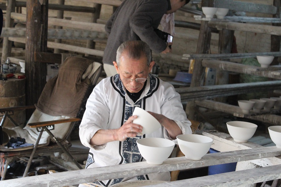 An elderly porcelain artist trims unfired porcelain products at the Jingdezhen Ancient Kilns in Jingdezhen city, Jiangxi province on Nov. 18, 2014. (Photo/People's Daily Online)