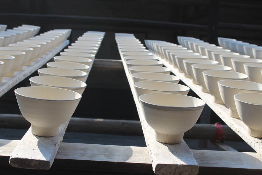 Unfinished porcelain is put under the sun to dry before put into the kiln, at the Jingdezhen Ancient Kilns in Jingdezhen city, Jiangxi province on Nov. 18, 2014. (Photo/People's Daily Online)