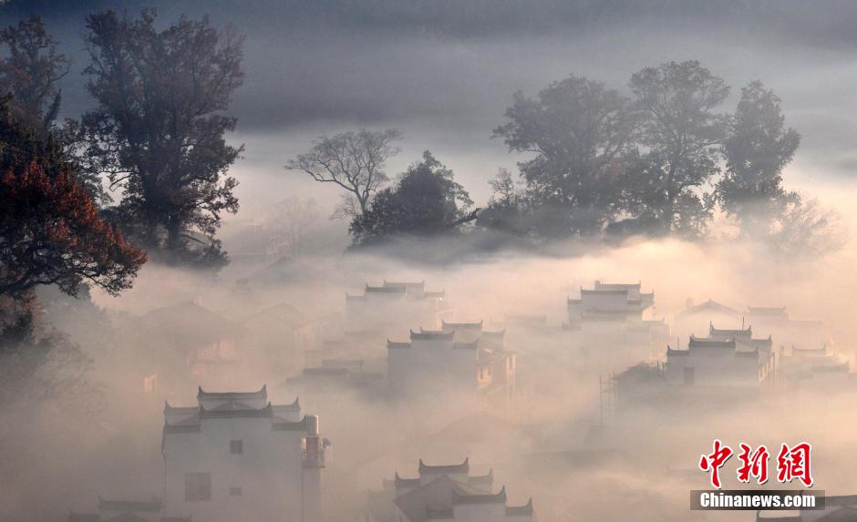 Huizhou-style folk dwelling houses in fog are fascinating at the beginning of winter in Wuyuan county, east China's Jiangxi province. (CNS/Hu Dunhuang)