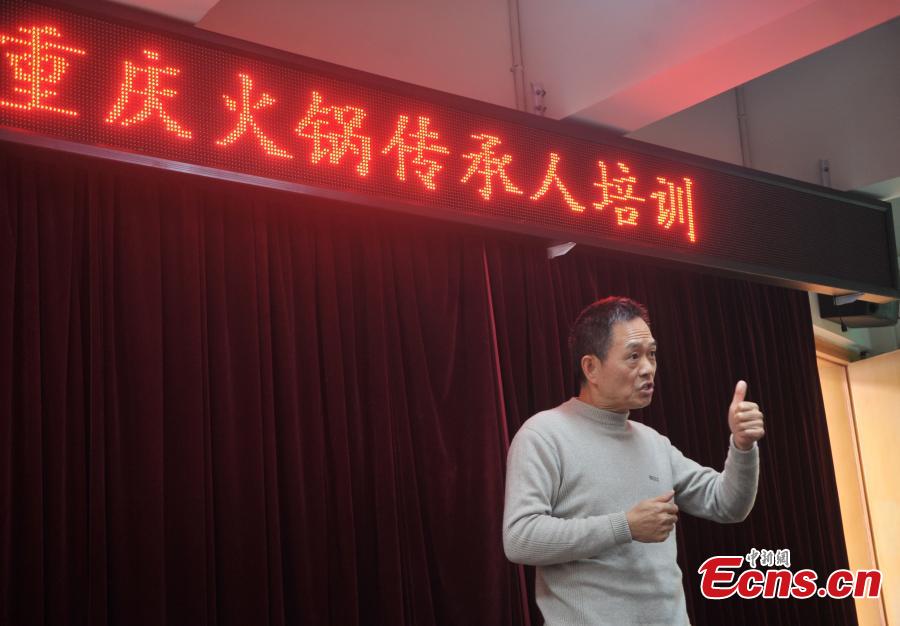 | Li Dejian, head of the hotpot association in Chongqing gives lecture to 40 students during a theory class of the Chongqing Hotpot Academy on November 25, 2014. The academy has been co-established by the Chongqing Hotpot Association, the Chongqing Cuisine Association and the Chongqing Modern Vocational Training Academy. [Photo: China News Service/ Chen Chao] |