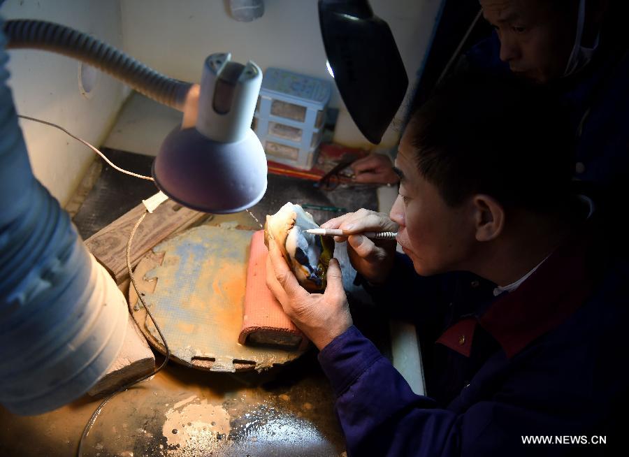 Craftsman Cao Zhitao engraves a jade at a studio in Fuxin City, northeast China's Liaoning Province, Nov. 24, 2014. (Xinhua/Li Gang)