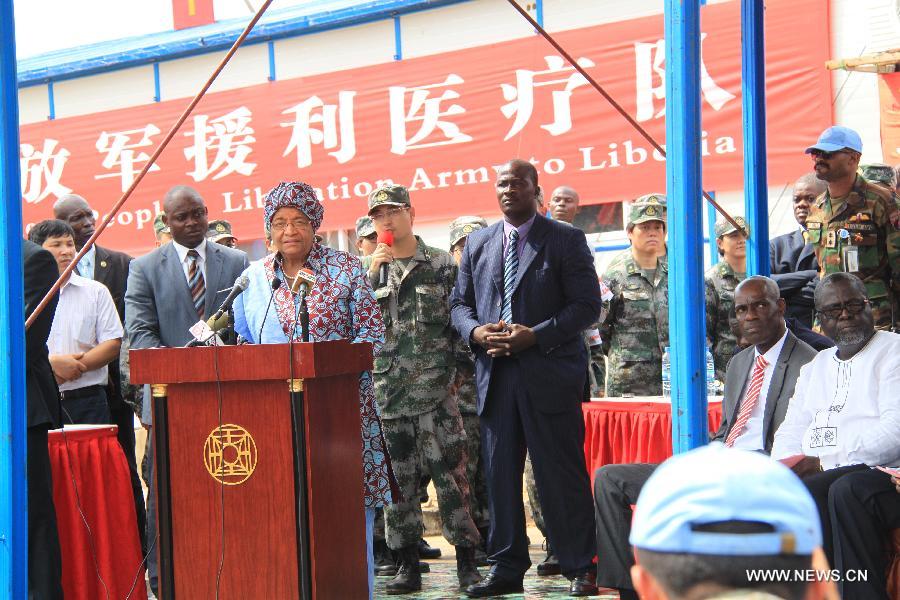 Liberian President Ellen Johnson Sirleaf speaks at the opening ceremony of the Ebola treatment center in Monrovia on Nov. 25, 2014. China opened a 100-bed treatment center in Liberia on Tuesday. (Xinhua/Dai Chunyong)