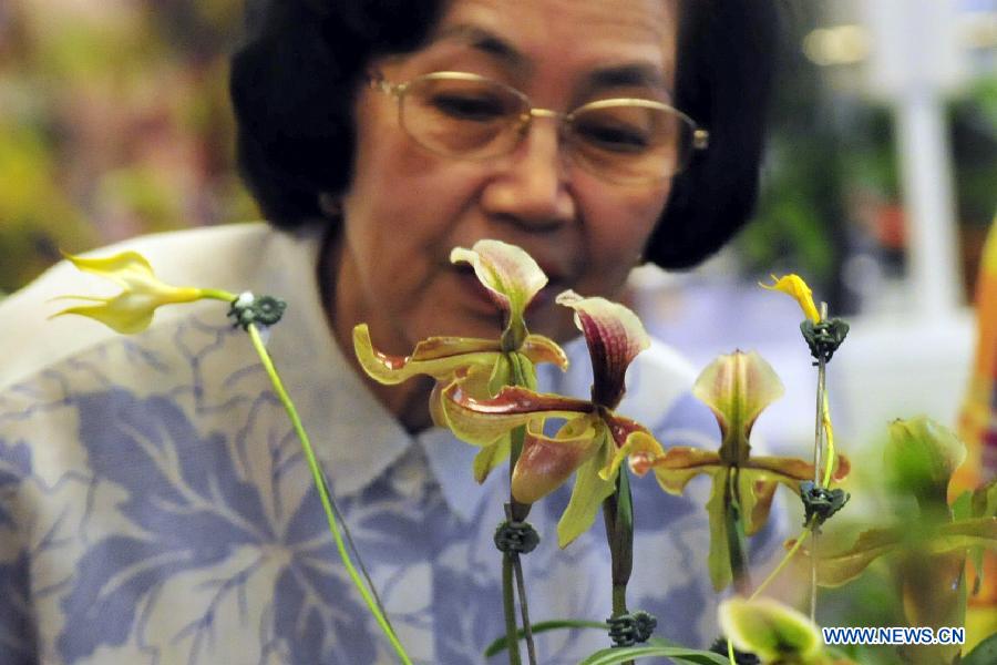 | A visitor watches orchids on the 8th Siam Paragon Bangkok Royal Orchid Paradise in Bangkok, Thailand, Nov. 27, 2014. (Xinhua/Rachen Sageamsak) |