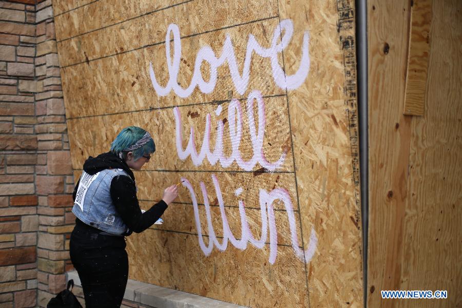 A resident paints mural on the board of a storefront in Ferguson, Missouri, the United States, on Nov. 26, 2014. Missouri Governor Jay Nixon has called in more National Guards to control the situation. Some 2,200 National Guards have been deployed in Ferguson by Wednesday. (Xinhua/Jim Vondruska)