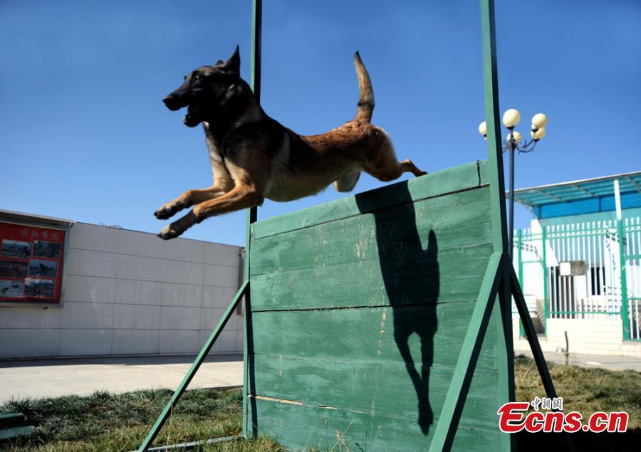 A rescue dog of a fire brigade crosses the barriers during a training program in Northwest China’s Gansu province. [Photo: China News Service/ Shi Yonghong]