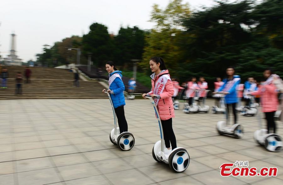 School beauties from over 20 Chinese universities ride two-wheeled scooters during a competition in Changsha, Hunan province on November 26, 2014. The event was held to promote low-carbon choices of transportation. [Photo/ Yang Huafeng]