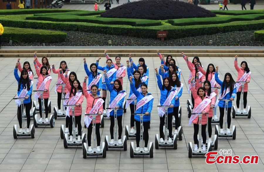 | School beauties from over 20 Chinese universities ride two-wheeled scooters during a competition in Changsha, Hunan province on November 26, 2014. The event was held to promote low-carbon choices of transportation. [Photo/ Yang Huafeng] |