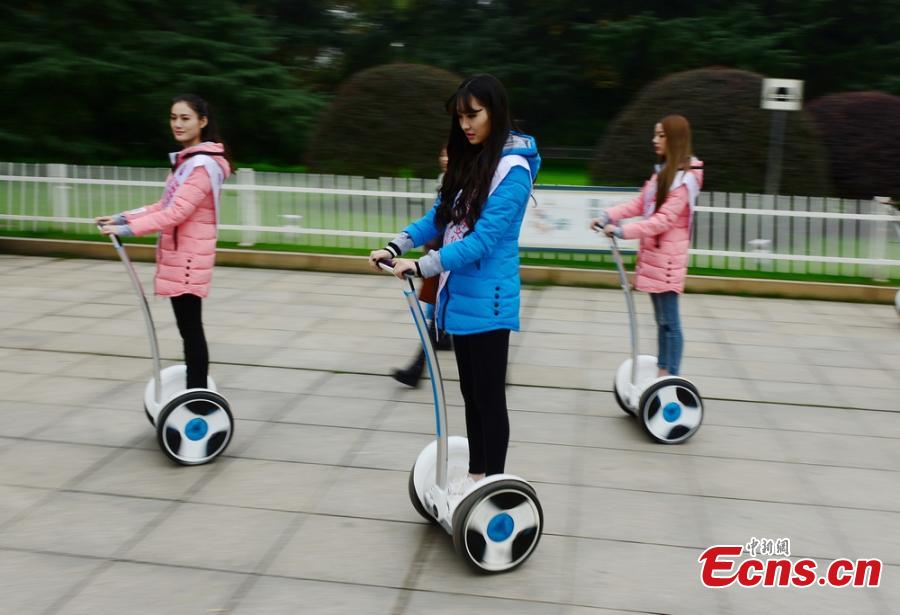 School beauties from over 20 Chinese universities ride two-wheeled scooters during a competition in Changsha, Hunan province on November 26, 2014. The event was held to promote low-carbon choices of transportation. [Photo/ Yang Huafeng]