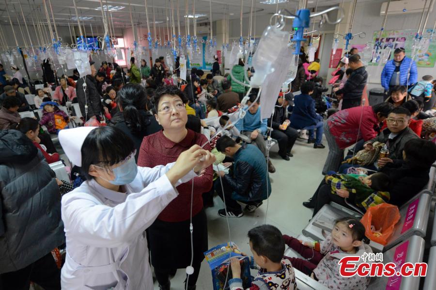 Children receive infusion at a children's hospital in Taiyuan of Shanxi province, November 26, 2014. Due to continued smog and temperature changes, the daily outpatient number recently has been increased by 50 percent than last month. Most of them suffered from respiratory diseases, according to doctors. [Photo: China News Service / Wei Liang]