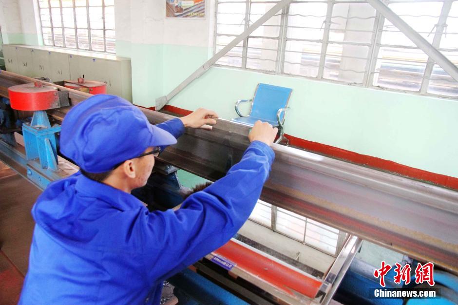 A worker does the final flatness measurement for the welded tracks. (CNS/Zhang Weidong)