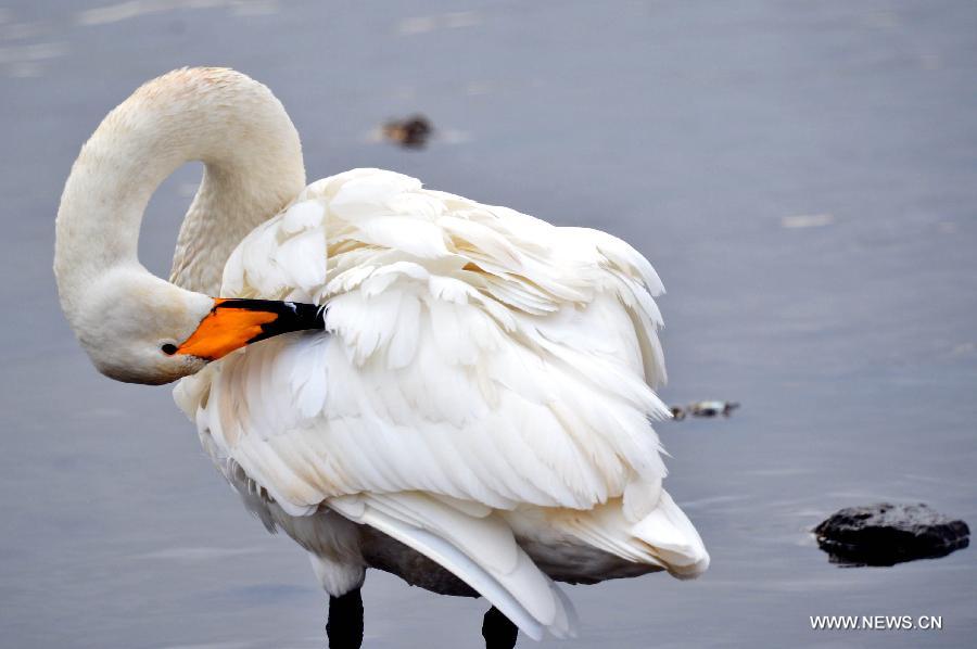 A swan preens its feathers on a lake in Rongcheng, east China's Shandong Province, Nov. 28, 2014. Several tens of thousands of swans migrating from Siberia converged in Rongcheng to pass the winter recently. (Xinhua/Guo Xulei)