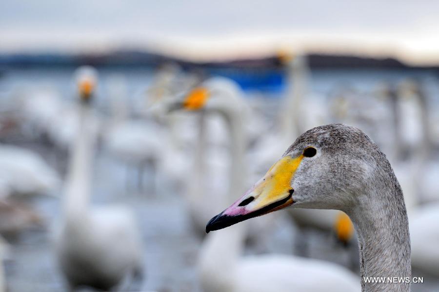 Swans rest on a lake in Rongcheng, east China's Shandong Province, Nov. 28, 2014. Several tens of thousands of swans migrating from Siberia converged in Rongcheng to pass the winter recently. (Xinhua/Guo Xulei)
