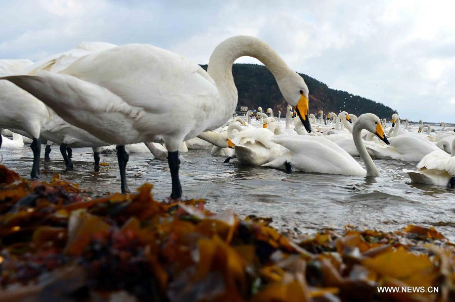 Swans look for food on a lake in Rongcheng, east China's Shandong Province, Nov. 28, 2014. Several tens of thousands of swans migrating from Siberia converged in Rongcheng to pass the winter recently. (Xinhua/Guo Xulei)
