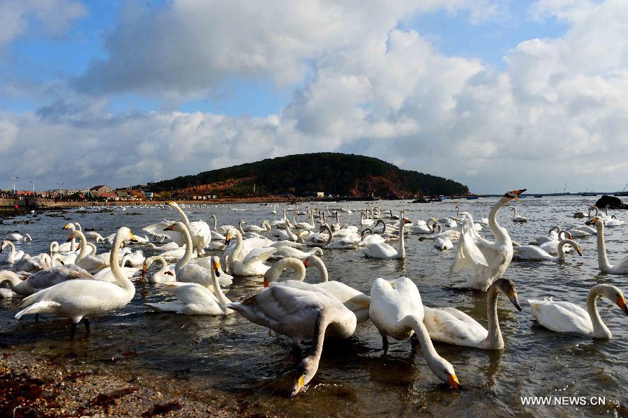 Swans look for food on a lake in Rongcheng, east China's Shandong Province, Nov. 28, 2014. Several tens of thousands of swans migrating from Siberia converged in Rongcheng to pass the winter recently. (Xinhua/Guo Xulei)