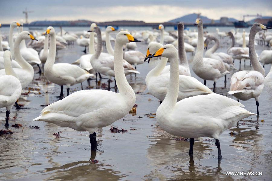 Swans play on a lake in Rongcheng, east China's Shandong Province, Nov. 28, 2014. Several tens of thousands of swans migrating from Siberia converged in Rongcheng to pass the winter recently. (Xinhua/Guo Xulei)