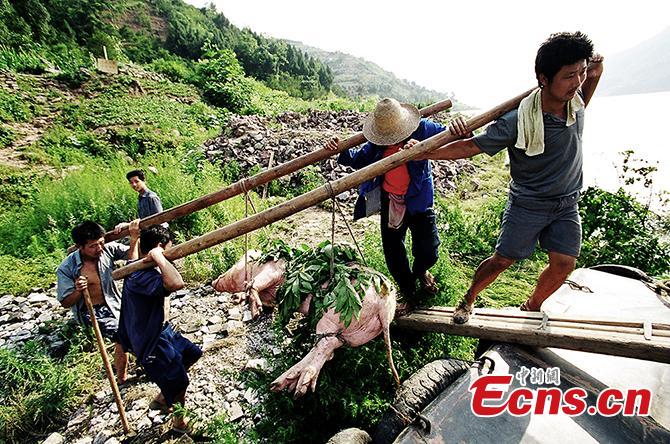 Residents of Zhongxian county of Chongqing lift a pig onto a boat on July 20, 2002. [Photo/Li Feng]