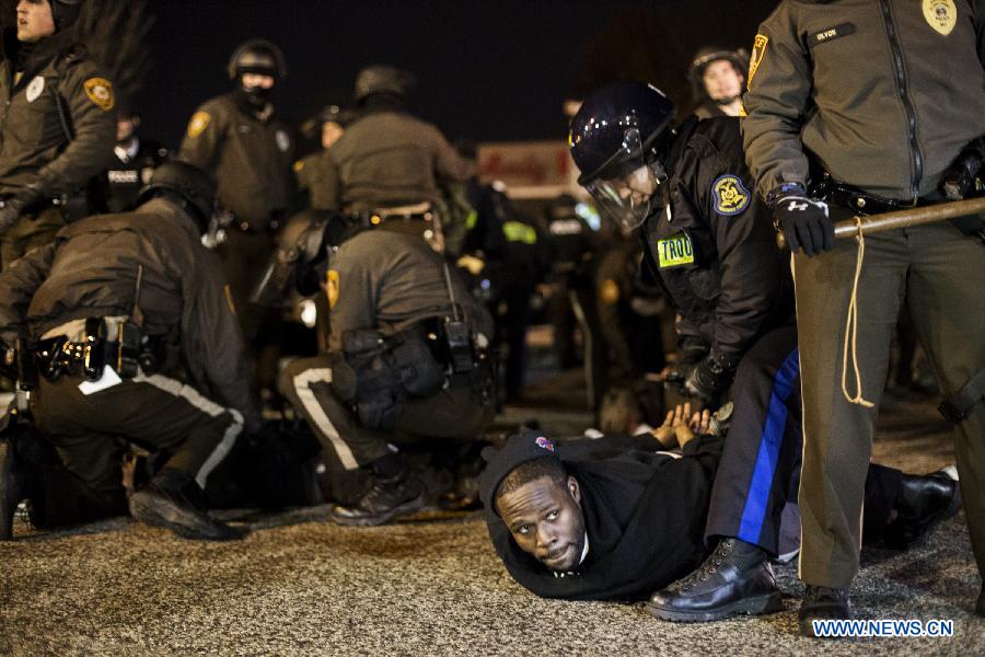 Policemen arrest a protester in front of the Ferguson PD Station in Ferguson, Missouri, the United States, on Nov. 28, 2014. Police arrested 15 people Friday night as about 100 protesters blocked traffic in front of the local police department in Ferguson. The protest was the latest one in reaction to the non-indictment of police officer Darren Wilson, who shot and killed unarmed 18-year-old black youth Michael Brown in August. (Xinhua/Jim Vondruska)