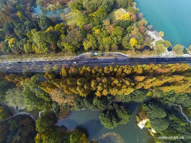 This bird eye view shows trees along a road in the scenic spot of West Lake in Hangzhou, capital of east China's Zhejiang Province, Dec. 1, 2014. (Xinhua/Xu Yu)