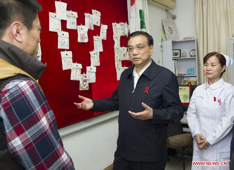 Chinese Premier Li Keqiang(C) talks with volunteers during his visit to Beijing's YouAn Hospital, home to a center for HIV/AIDS treatment, in Beijing, capital of China, ahead of World AIDS Day. (Xinhua/Xie Huanchi)