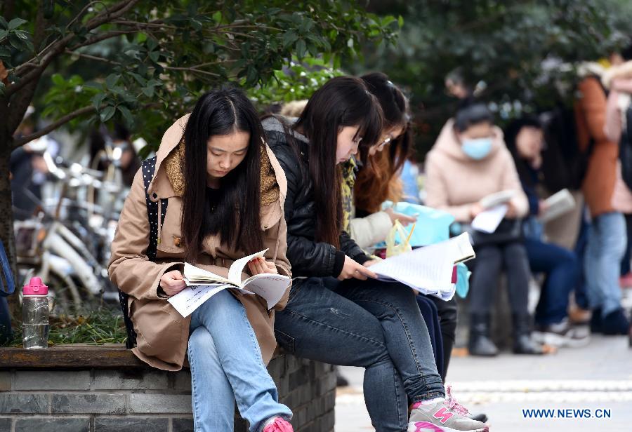 Candidates prepare for examination at Nanjing Forestry University exam site in Nanjing, capital of east China's Jiangsu Province, Nov. 30, 2014. 2015 National Civil Service Examination began on Sunday, offering at least 22,200 vacancies as planned. (Xinhua/Sun Can)