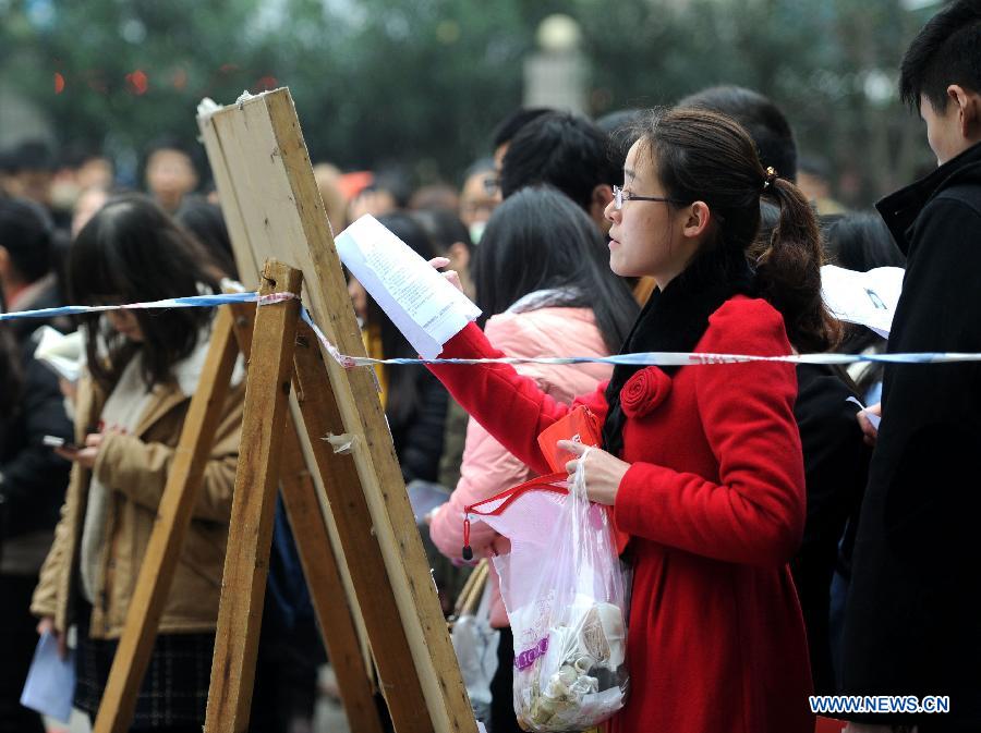 A candidate checks her information at Anhui University of Chinese Medicine exam site in Hefei, capital of east China's Anhui Province, Nov. 30, 2014. The 2015 National Civil Service Examination began on Sunday, offering at least 22,200 vacancies as planned. (Xinhua/Liu Junxi)