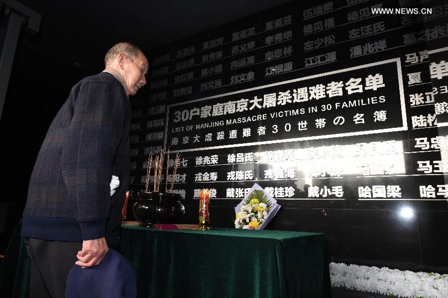 She Ziqing, a survivor of the Nanjing Massacre, mourns his family members in front of a wall with "List of Nanjing Massacre Victims in 30 Families" at the Memorial Hall of the Victims in Nanjing Massacre by Japanese Invaders in Nanjing, capital of east China's Jiangsu Province, Dec. 1, 2014. A series of ceremonies were held by people to mourn their family members killed in the 1937 massacre ahead of the National Memorial Day for Nanjing Massacre Victims, which falls on Dec. 13. (Xinhua/Sun Can)