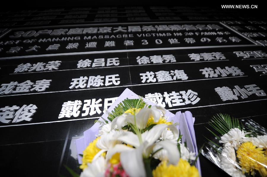 Flowers are presented in front of a wall with "List of Nanjing Massacre Victims in 30 Families" at the Memorial Hall of the Victims in Nanjing Massacre by Japanese Invaders in Nanjing, capital of east China's Jiangsu Province, Dec. 1, 2014. A series of ceremonies were held by people to mourn their family members killed in the 1937 massacre ahead of the National Memorial Day for Nanjing Massacre Victims, which falls on Dec. 13. (Xinhua/Sun Can)